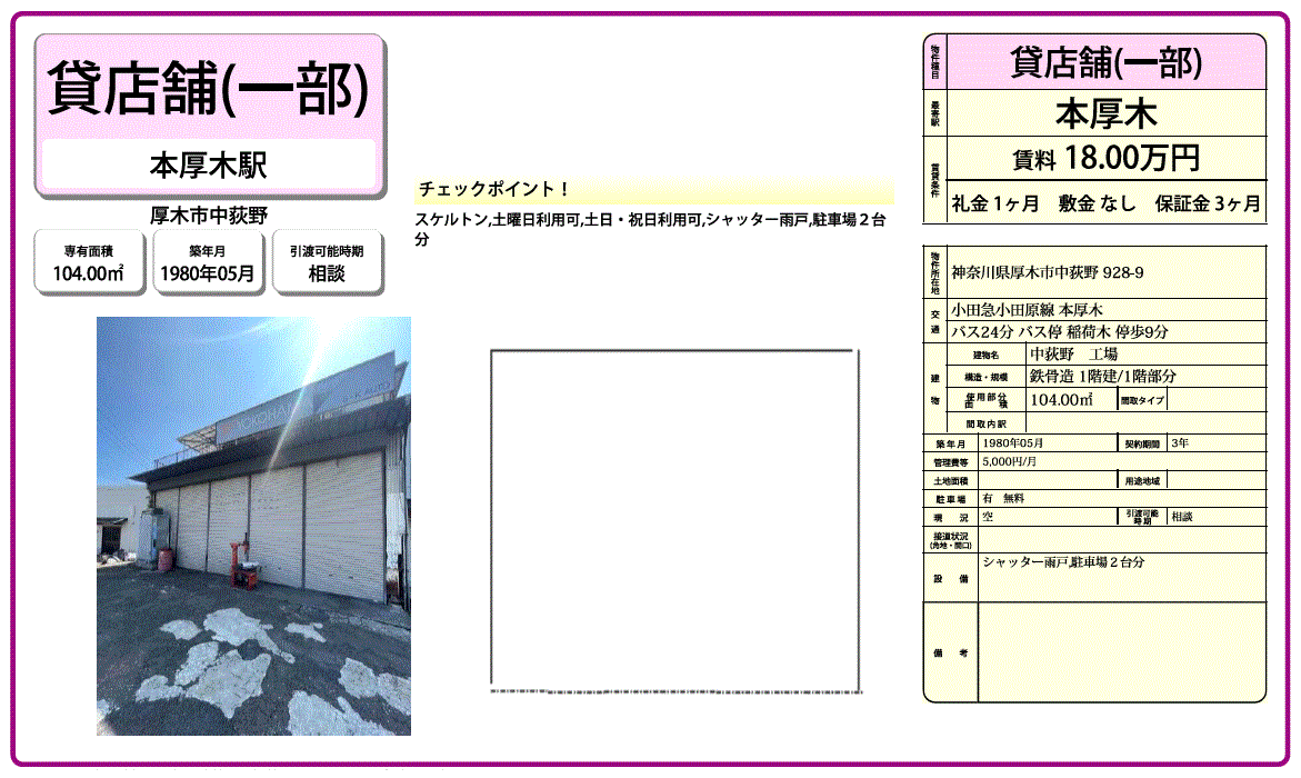 建物面積 | 104m²/31.46坪 | 構造/階数 | 鉄骨造/平家建 |