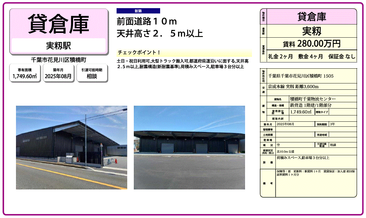| 周辺状況 | 土日祝利用可 大型トラック搬入可 | ||