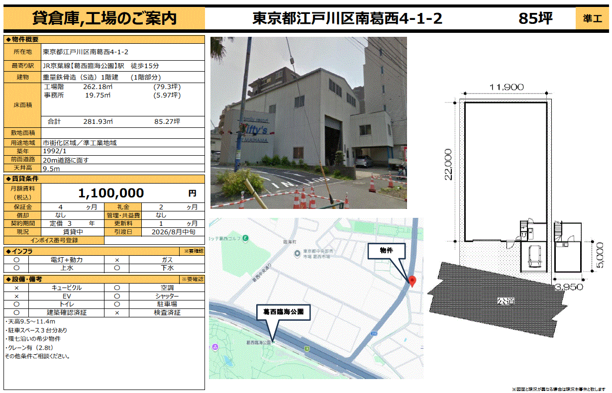 *契約期間更新可 *3年定期建物賃貸借契約 *天高9.5m~11.4m *その他諸条件相談可 ※写真は、以前の募集当時に撮影したものなので、現況と異なる場合があります。現況優先となります。 |