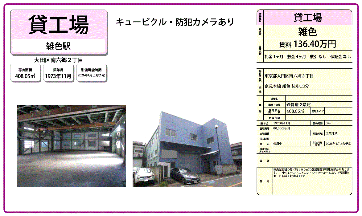 | 設備関連 | トイレ クレーン 事務所有 流し台 エアコン(残置物) 電気引き込み有 上水道 | ||