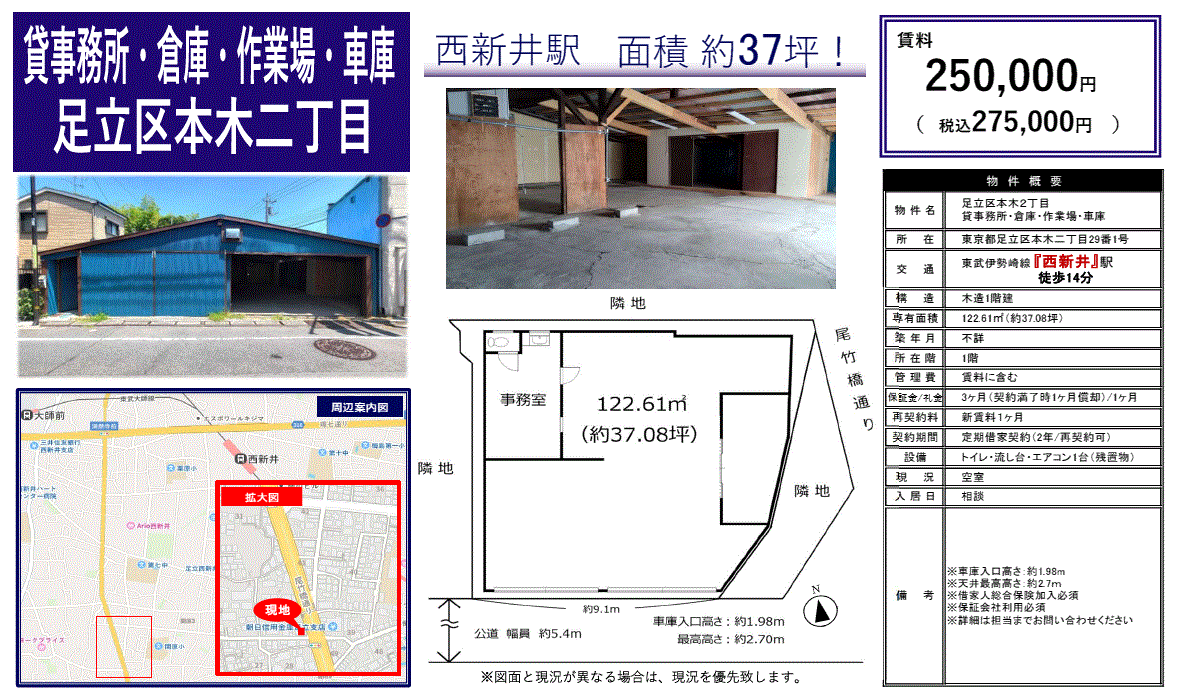 *2年定期建物賃貸借契約 *再契約料:新賃料の1ヶ月分 *車庫入口高さ約1.98m *天井最高約2.7m *借家人賠償責任付保険加入要 *保証会社加入要 *築年月日不詳 |