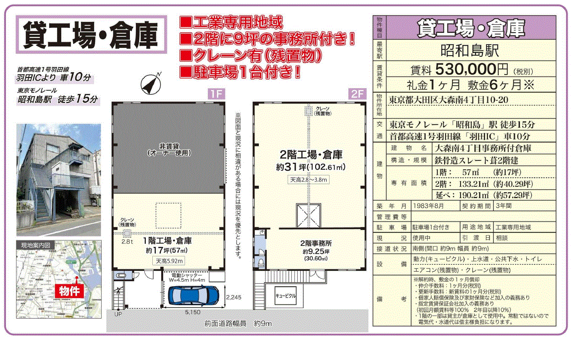 沿線/駅 | 東京モノレ/昭和島駅 徒歩15分 | 高速道路出入口 | 首都高速1号羽田線 羽田 |