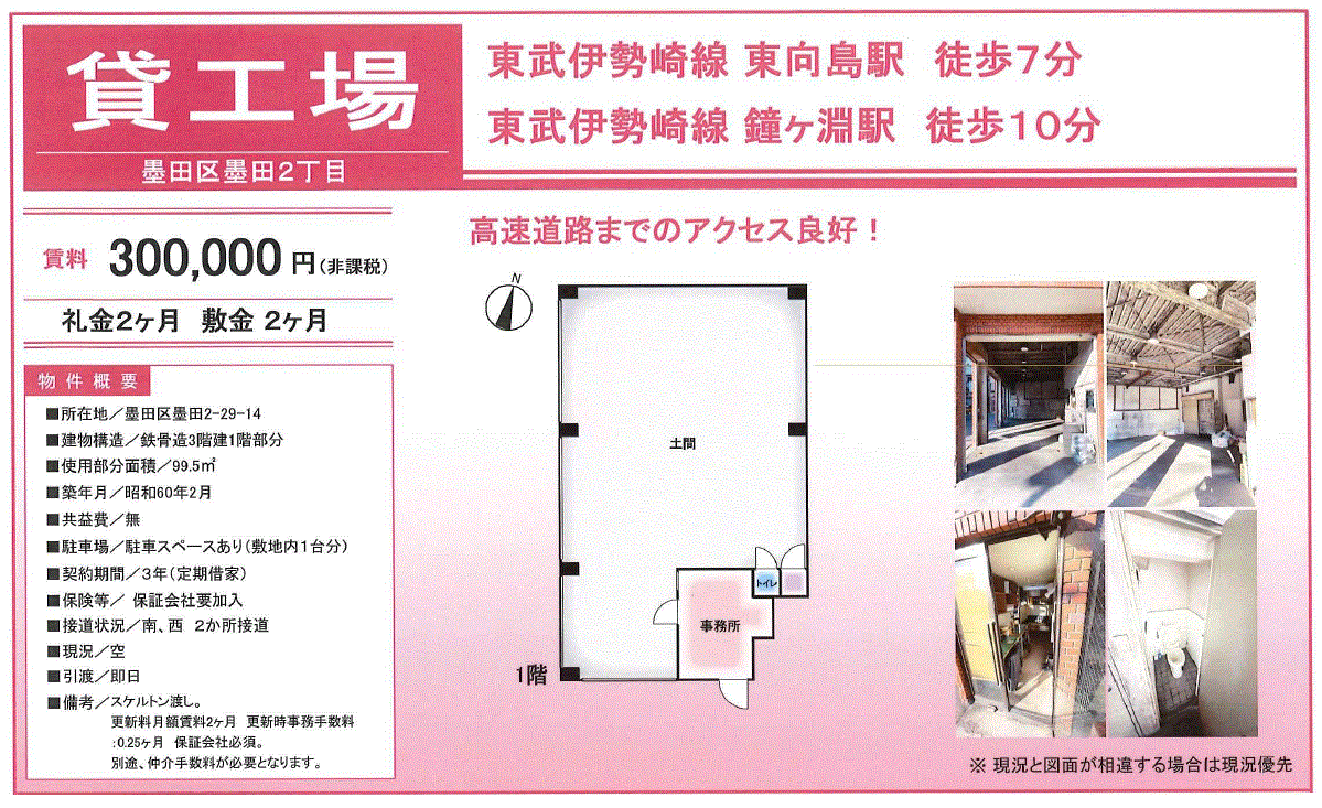 | 沿線/駅 | 伊勢崎線/東向島駅 徒歩7分 | 高速道路出入口 | |