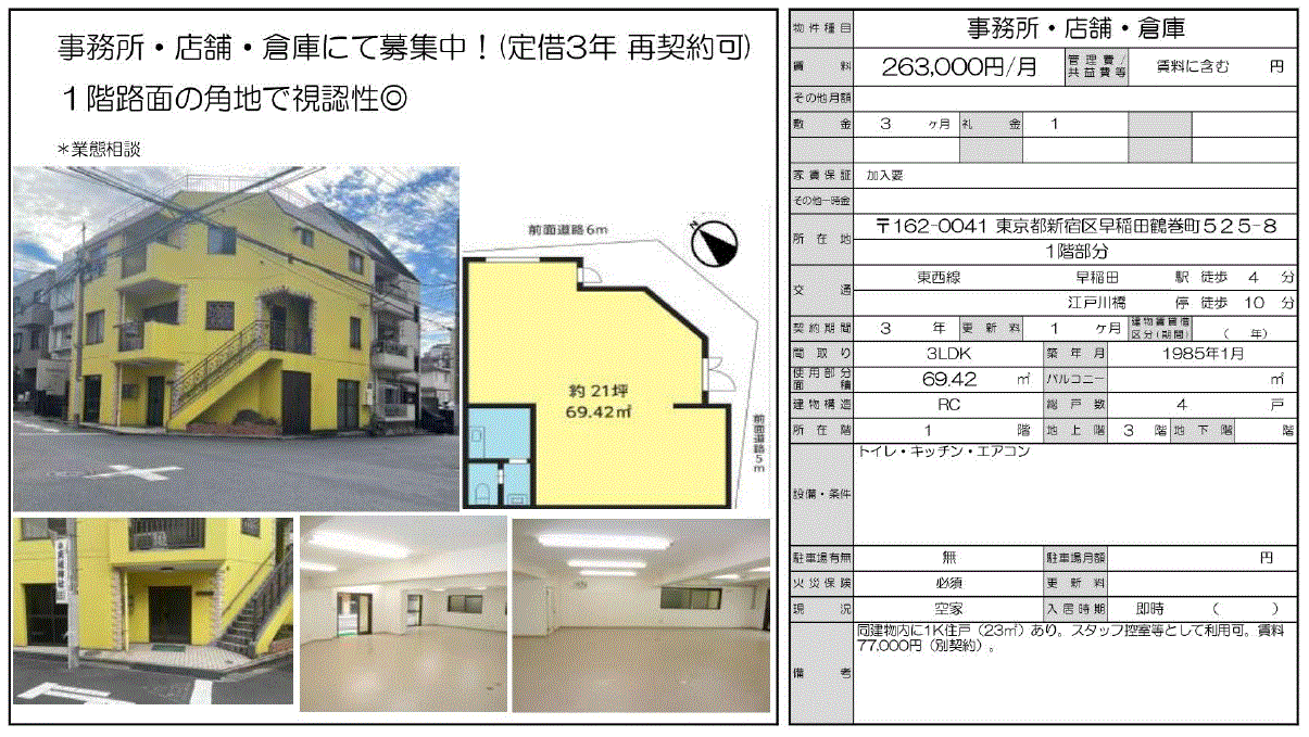 | 沿線/駅 | 東西線/早稲田駅 徒歩4分 | 高速道路出入口 | |