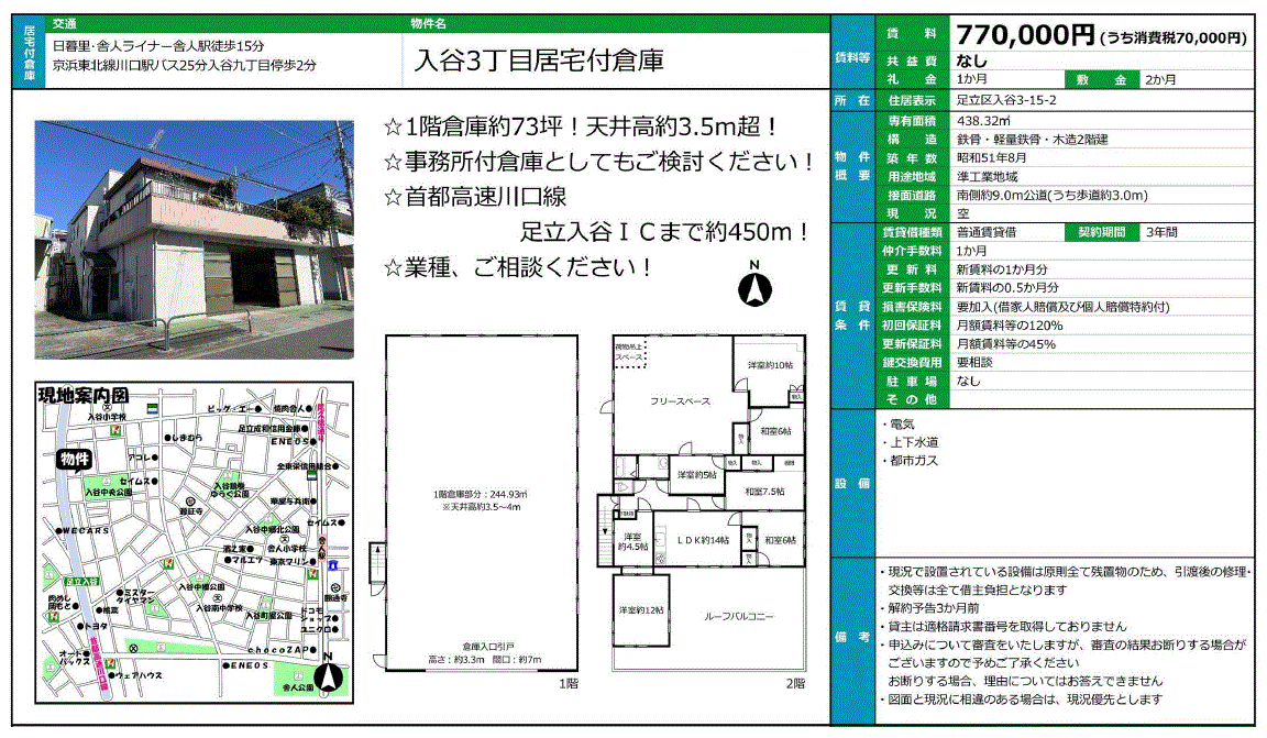 *1階天井高約3.5m~4m *解約予告3ヶ月前 *インボイス不可 *更新事務手数料:新賃料の0.5ヶ月分 *借家人賠償責任付保険加入要 *保証会社加入要 |