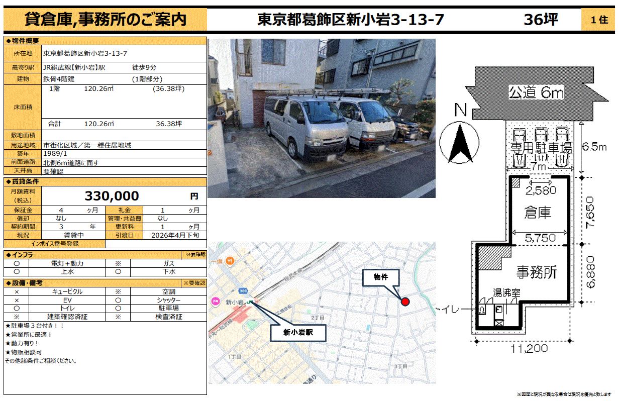 | 沿線/駅 | 総武線/新小岩駅 徒歩9分 | 高速道路出入口 | |