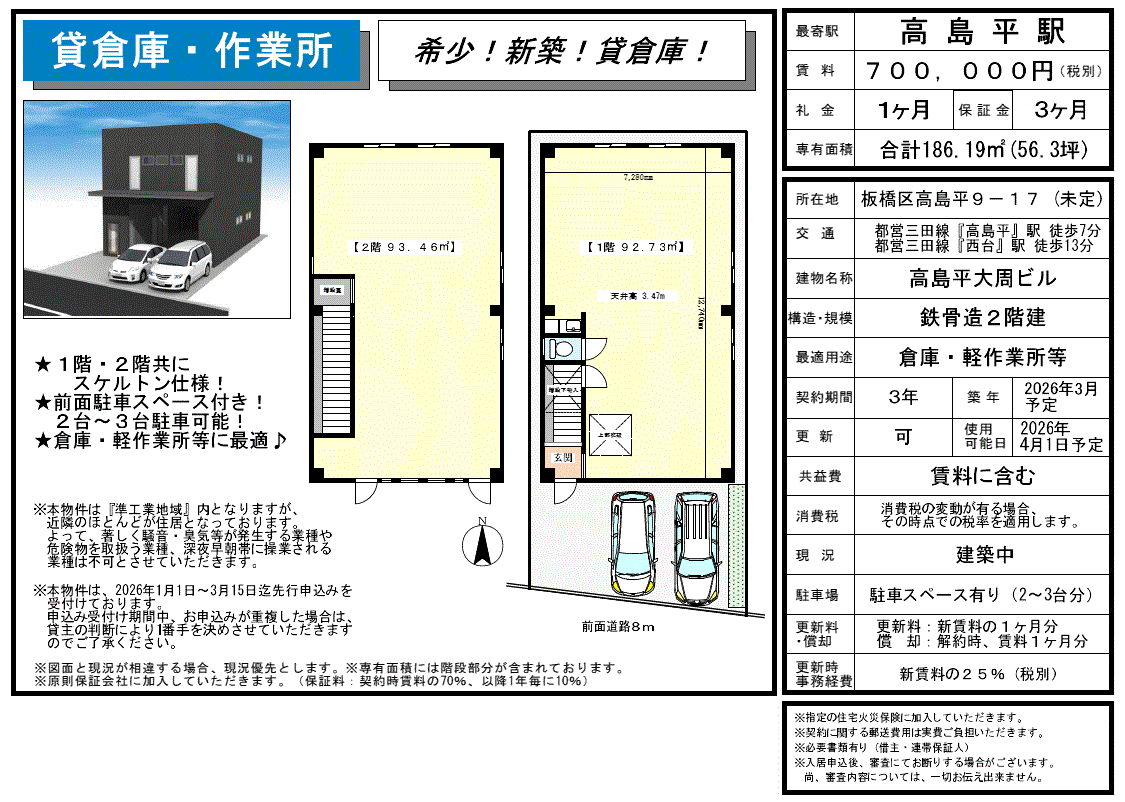 *天井高:1階3.47m *更新事務手数料:新賃料の25%ヶ月 *保証会社加入要 *指定火災保険加入要 |