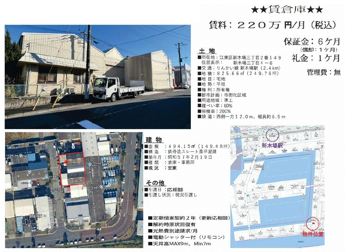 *木材、機械類はありません *電柱1本有 *建物高7m~9.33m *光熱費別途請求 |