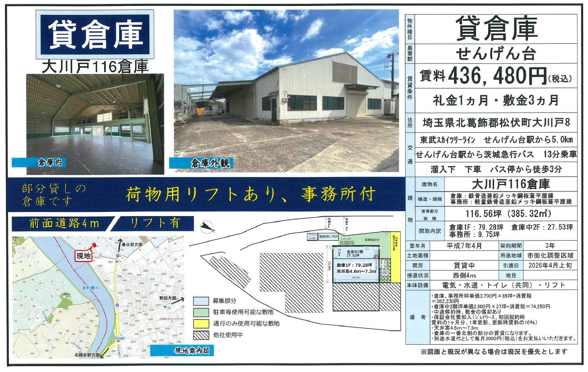 *天井高4.6m~7.3m *中途解約時、解約違約金あり *指定保証会社加入要 *水道代:月額3,300円 ※写真は、以前の募集当時に撮影したものなので、現況と異なる場合があります。現況優先となります。 |
