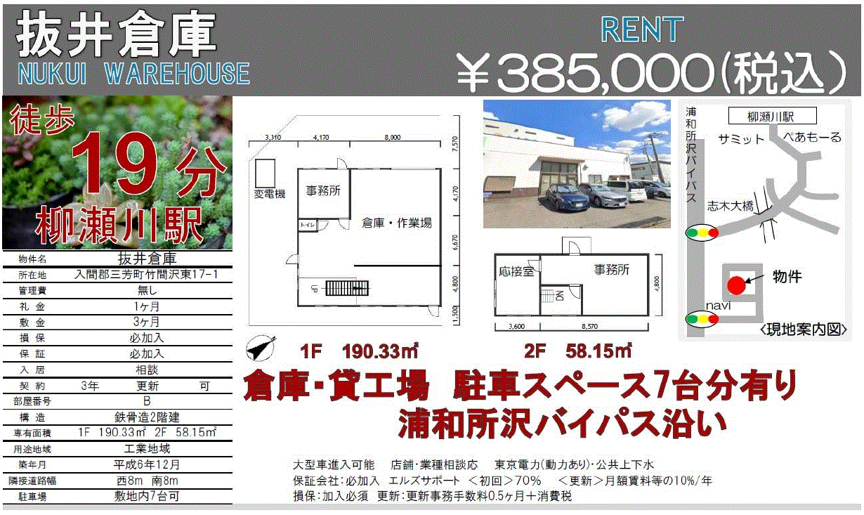 | 沿線/駅 | 東武東上線/柳瀬川駅 徒歩19分 | 高速道路出入口 | |