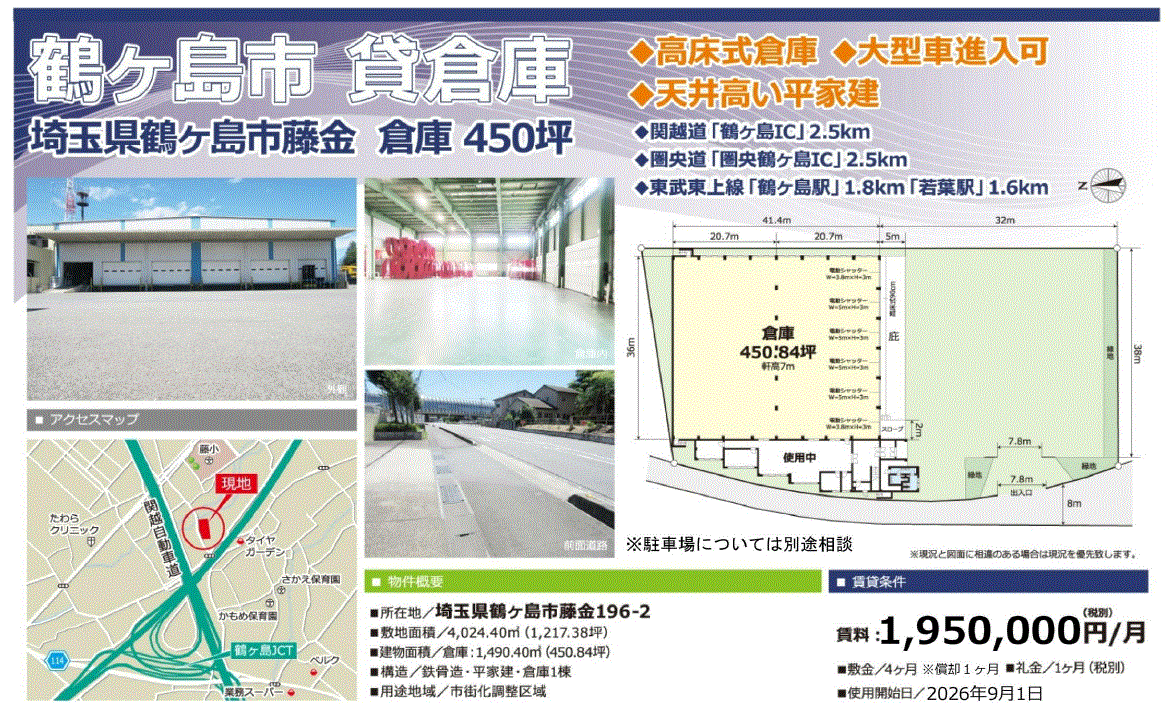 | 沿線/駅 | 東武東上線/若葉駅 徒歩20分以上 | 高速道路出入口 | 関越自動車道 鶴ヶ島から約2km |