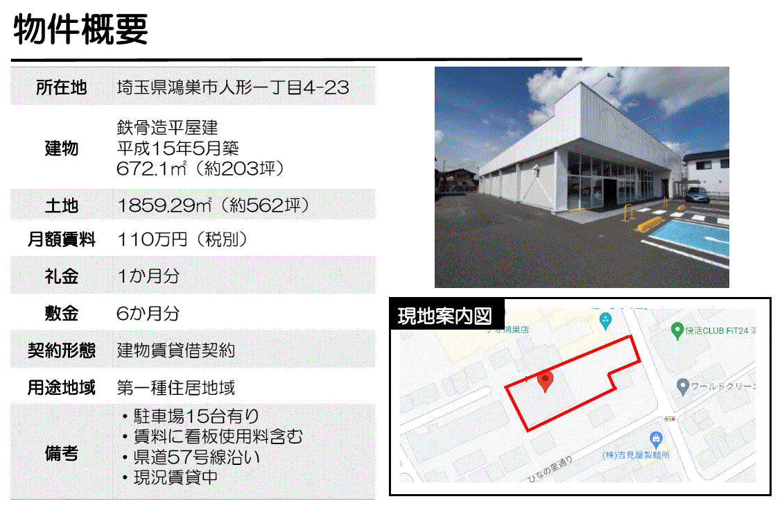 必ずしも営業可能な業種とは限りませんので用途地域の制限等弊社担当までご確認ください。 - 大型車両欄の「可」の表示については前面道路幅員が概ね6m以上の道路として住宅地図上から判断したものです。実際については現地をご確認ください。