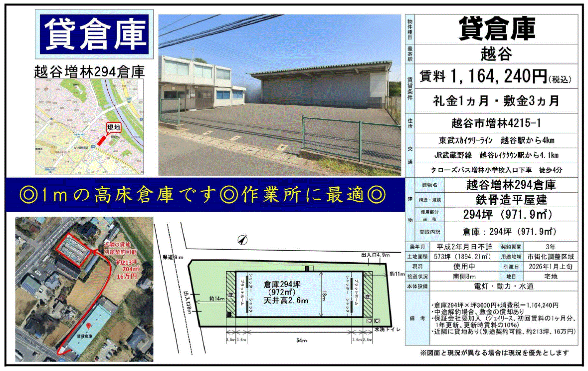 *天井高2.6m *中途解約時、解約違約金あり *指定保証会社加入要 *近隣に別途契約可能な貸地あり(約213坪、賃料16万円) |
