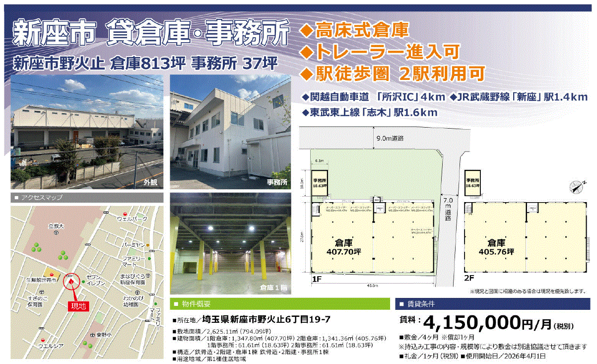 沿線/駅 | 武蔵野線/新座駅 徒歩18分 | 高速道路出入口 | 関越自動車道 所沢から約4km |