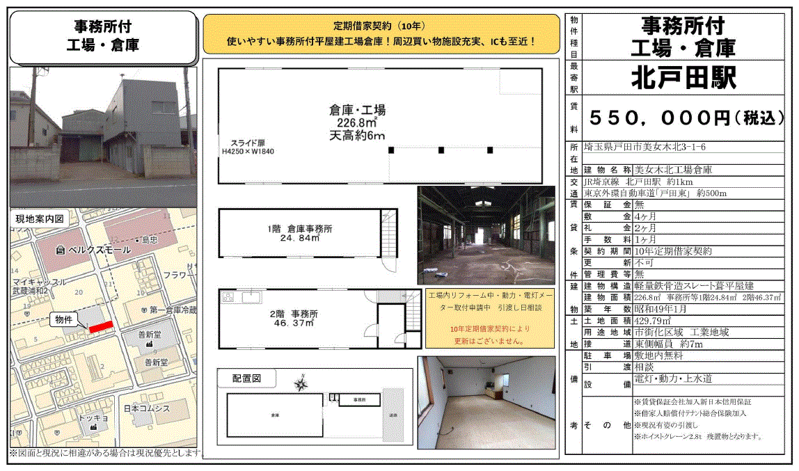 設備関連 | 電気引き込み有 動力 2.8tクレーン(残置物) 事務所棟有 | ||