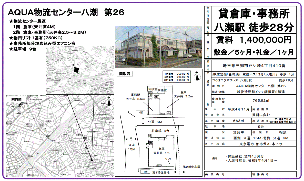 周辺状況 | 首都高速6号線「三郷八潮IC」「三郷八潮南IC」約3Km 近隣民家有 | ||