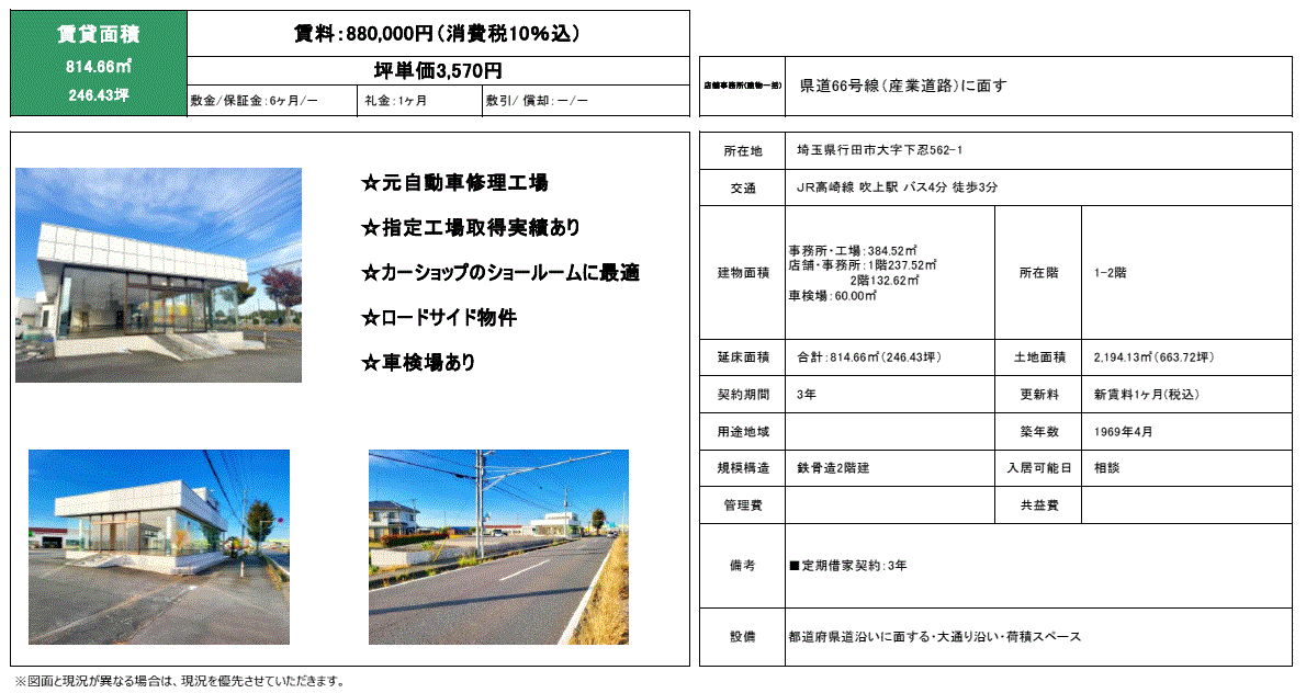 *3年定期建物賃貸借契約(期間相談可能) *再契約料:新賃料の1ヶ月分 *工場事務所:384.52m2(116.31坪)/店舗事務所:1階237.52m2(71.84坪)、2階132.62m2(40.11坪)/車検場:60m2(18.15坪) |