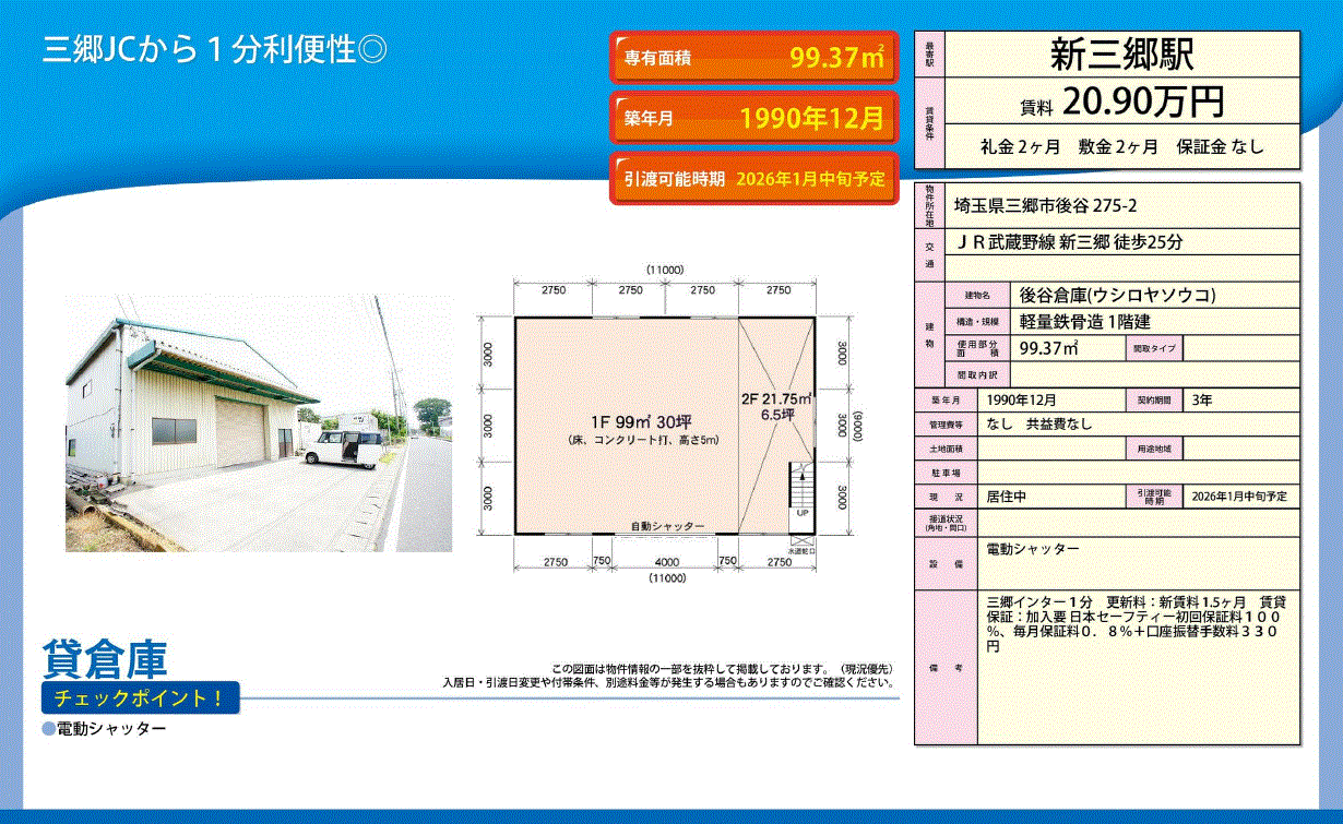 | 建物面積 | 99.37m²/30.06坪 | 構造/階数 | 軽量鉄骨/平家建 |
