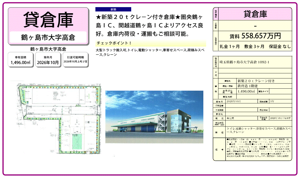 | 建物面積 | 1,496m²/452.54坪 | 構造/階数 | 鉄骨造/平家建 |