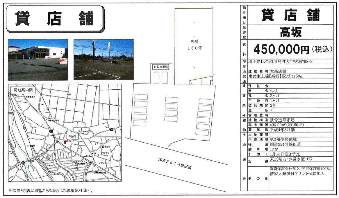 | 建物面積 | 496m²/150.04坪 | 構造/階数 | 鉄骨造/平家建 |