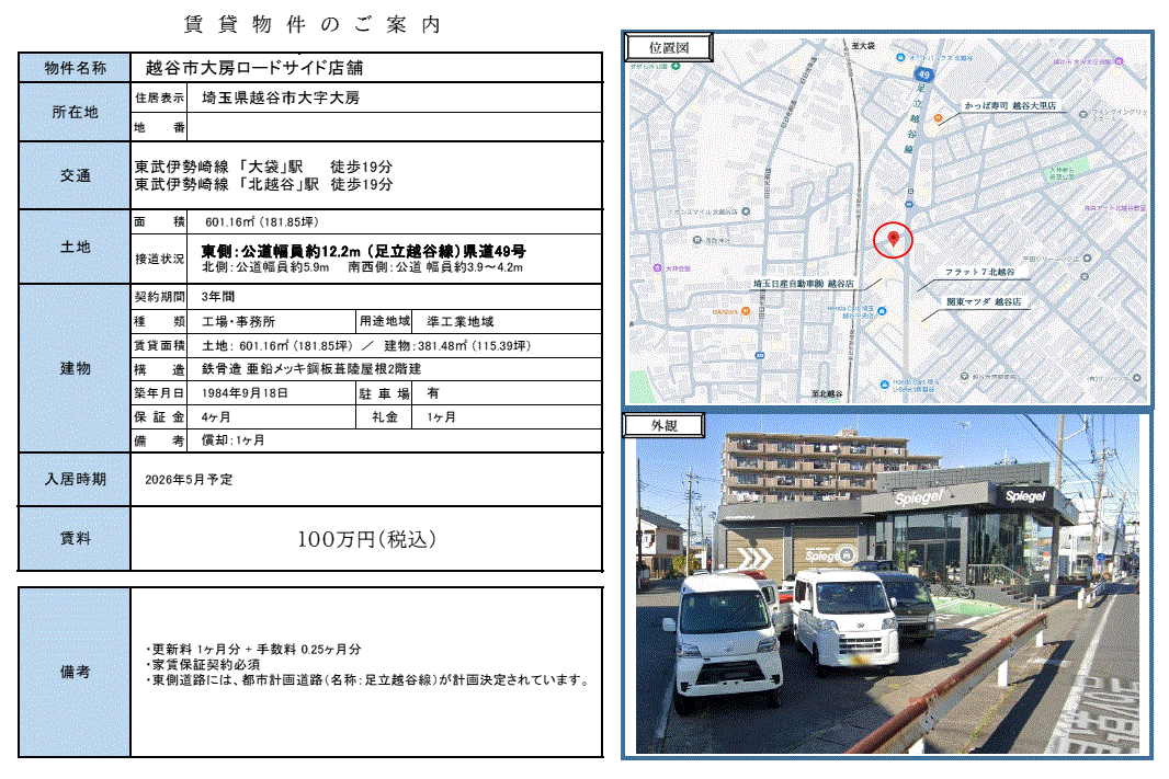 | 沿線/駅 | 伊勢崎線/大袋駅 徒歩19分 | 高速道路出入口 | |