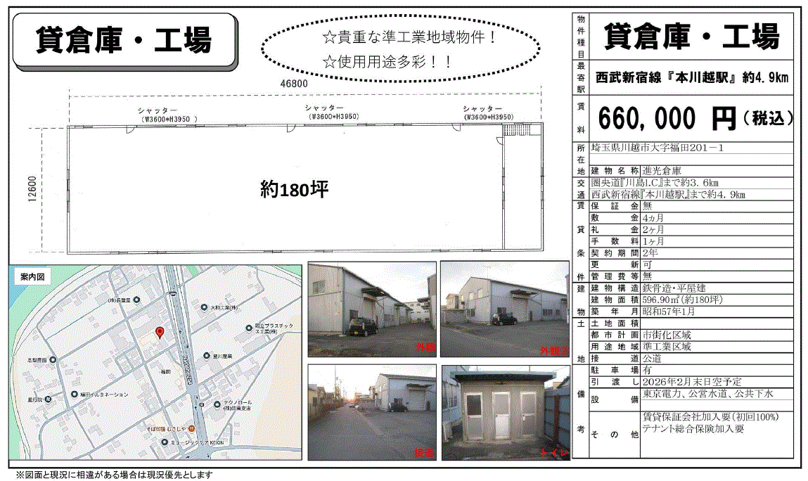 | 建物面積 | 596.9m²/180.56坪 | 構造/階数 | 鉄骨造/平家建 |
