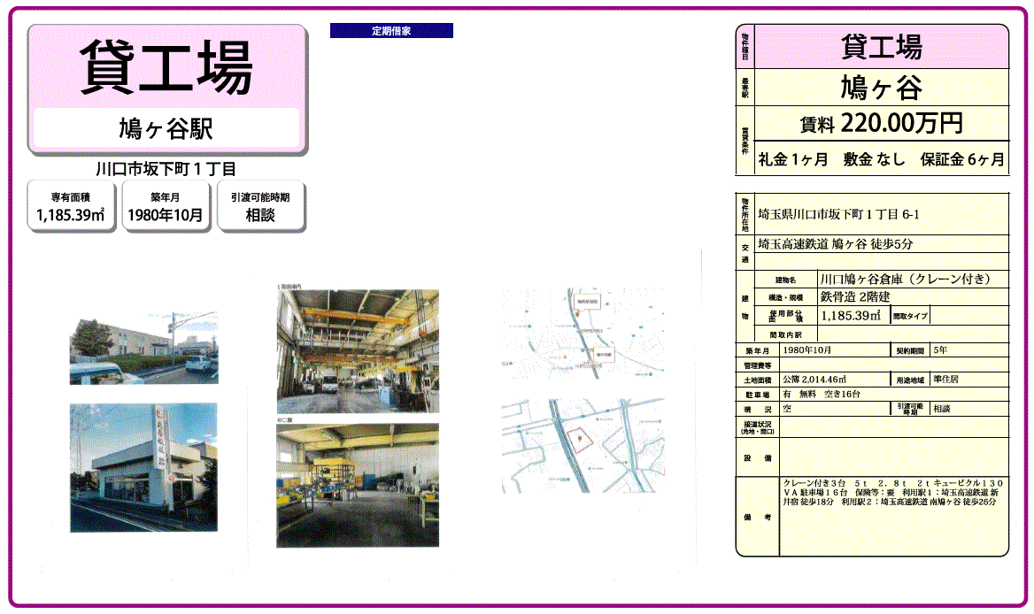 | 設備関連 | 電気引き込み有 2tクレーン 2.8tクレーン 5tクレーン キュービクル130VA 上水道 本下水 トイレ | ||