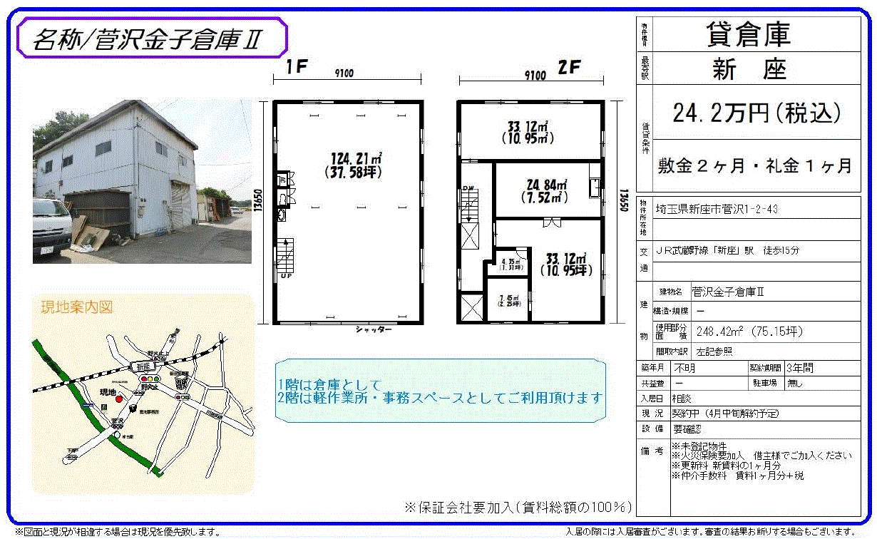 | 建物面積 | 248.42m²/75.15坪 | 構造/階数 | 鉄骨造/2階建ての1~2階部分 |