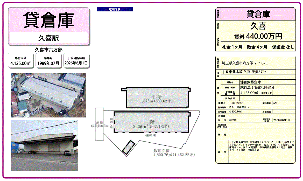 | 沿線/駅 | 東北本線/久喜駅 徒歩20分以上 | 高速道路出入口 | 東北自動車道 久喜から約4km |