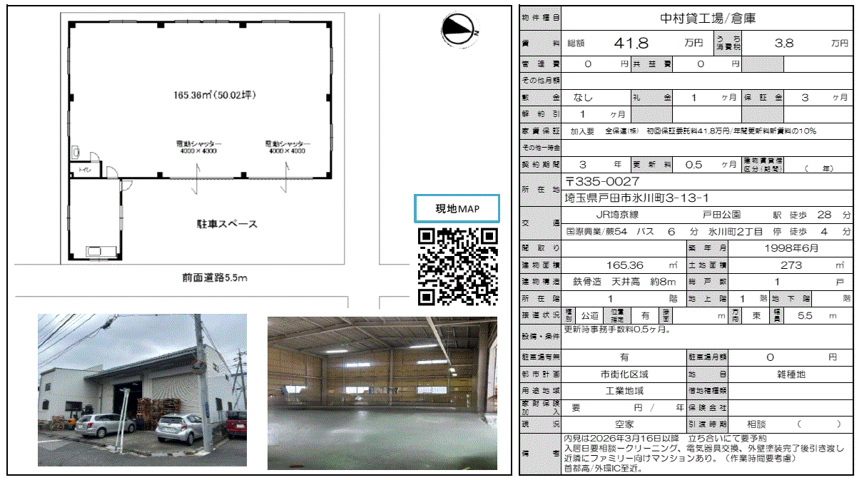| 設備関連 | 電気 上水道 下水道 トイレ 事務所有 電動シャッター 流し台 | ||