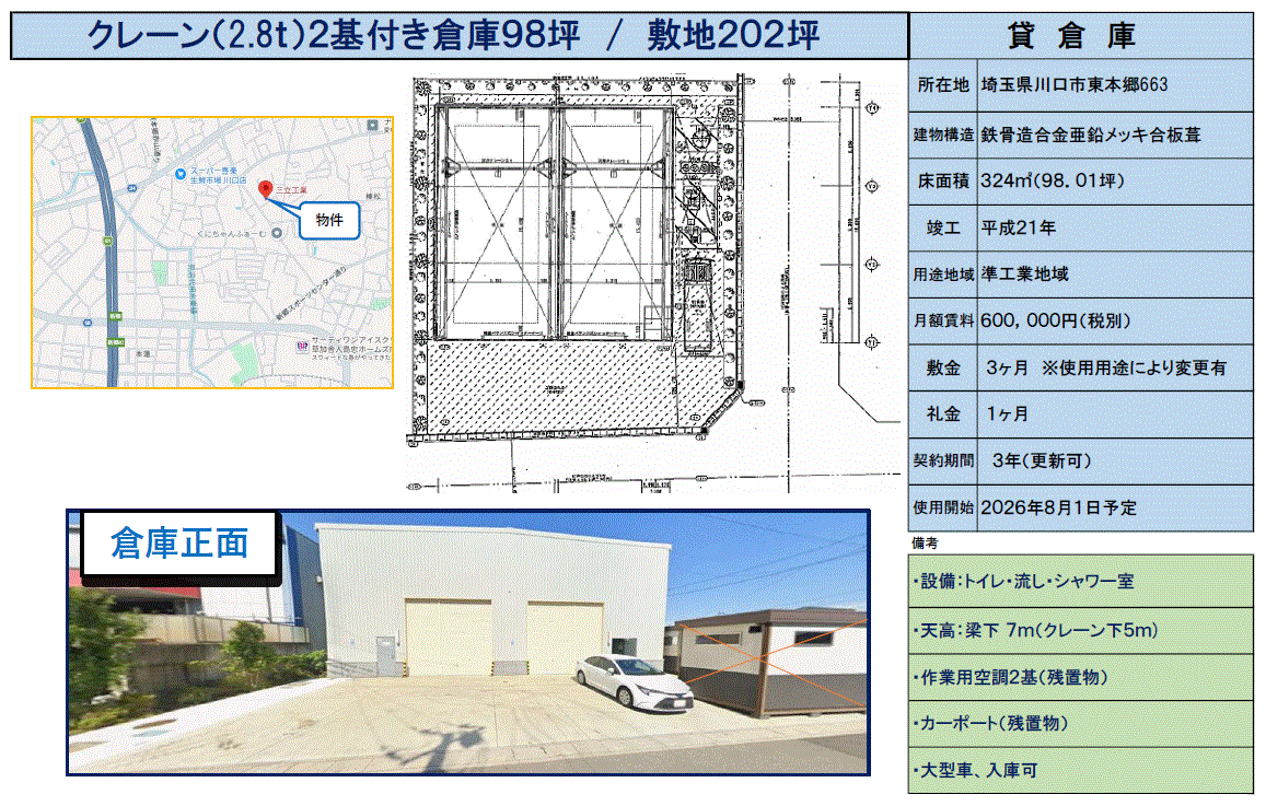 | 設備関連 | 電気引き込み有 上水道 流し台 シャワー トイレ 2.8tクレーン2基 | ||