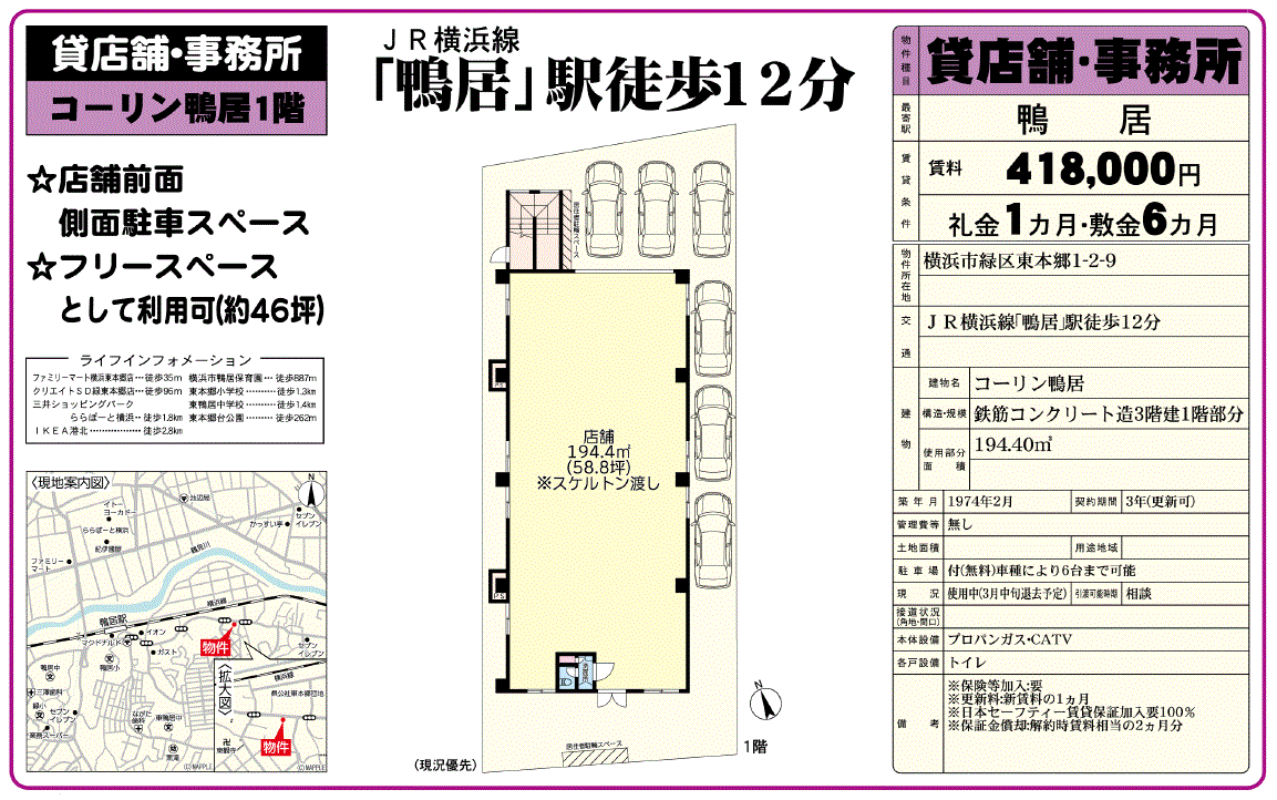 | 沿線/駅 | 横浜線/鴨居駅 徒歩12分 | 高速道路出入口 | |