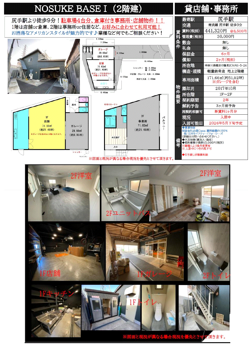 | 建物面積 | 171.66m²/51.93坪 | 構造/階数 | 軽量鉄骨/2階建ての1~2階部分 |
