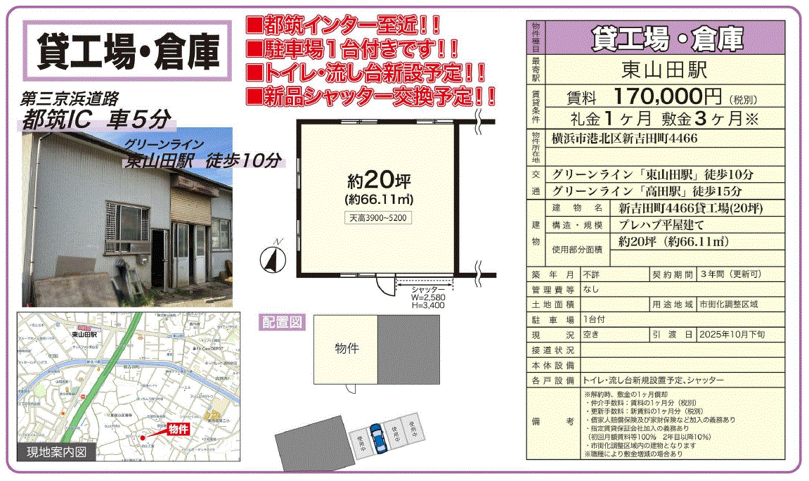 上水道 *トイレ、流し台新設予定 *新品シャッター交換予定 |