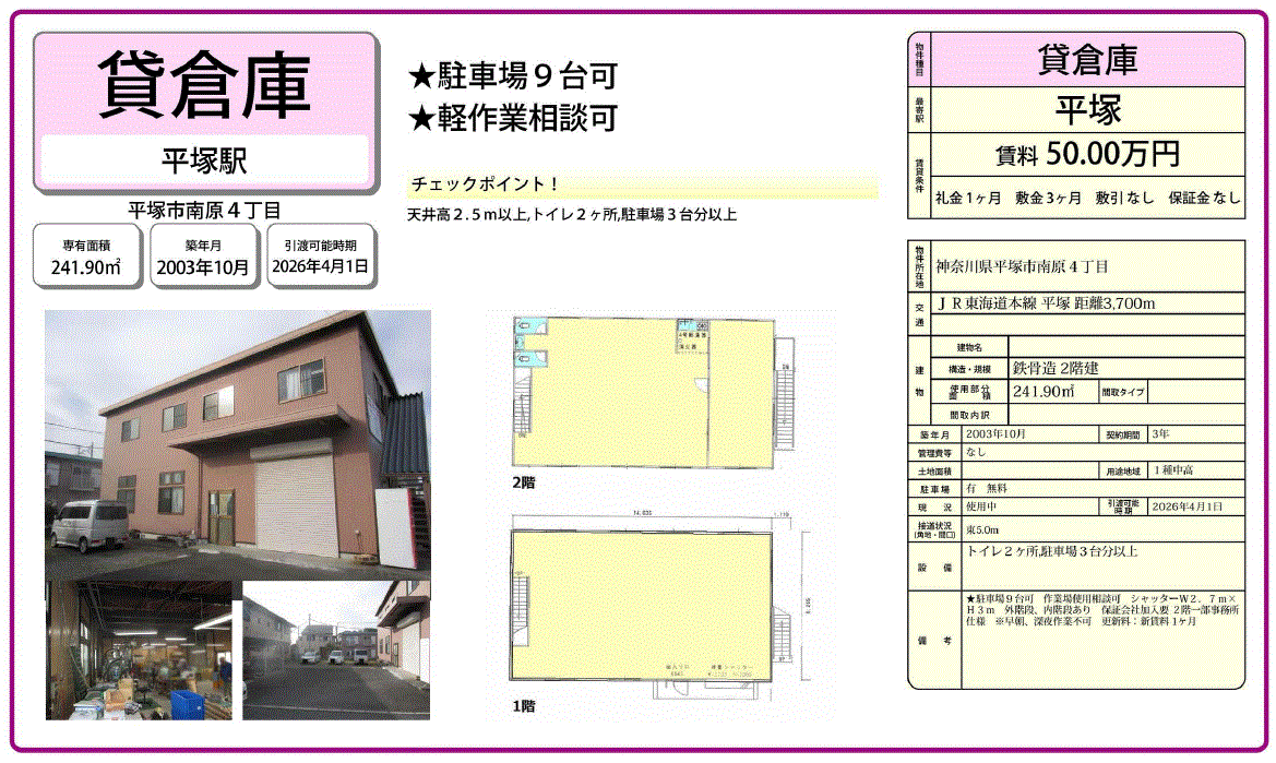 | 建物面積 | 241.9m²/73.17坪 | 構造/階数 | 鉄骨造/2階建ての1~2階部分 |