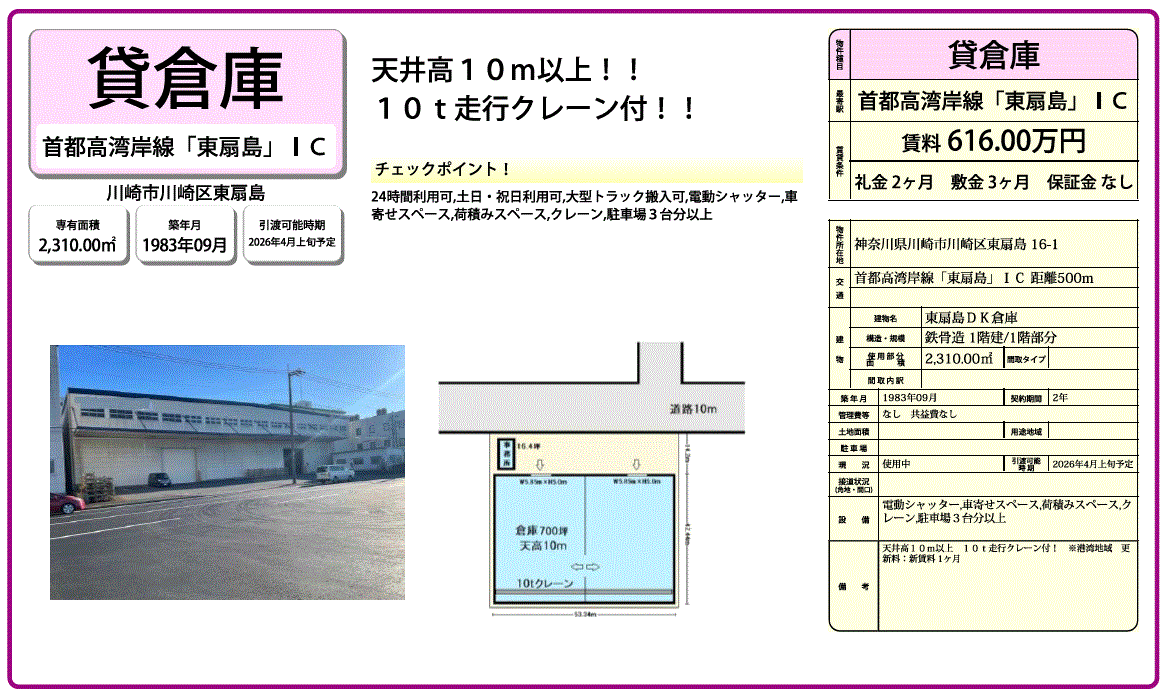 | 沿線/駅 | 鶴見線/昭和駅 徒歩20分以上 | 高速道路出入口 | 首都高速湾岸線 東扇島 |