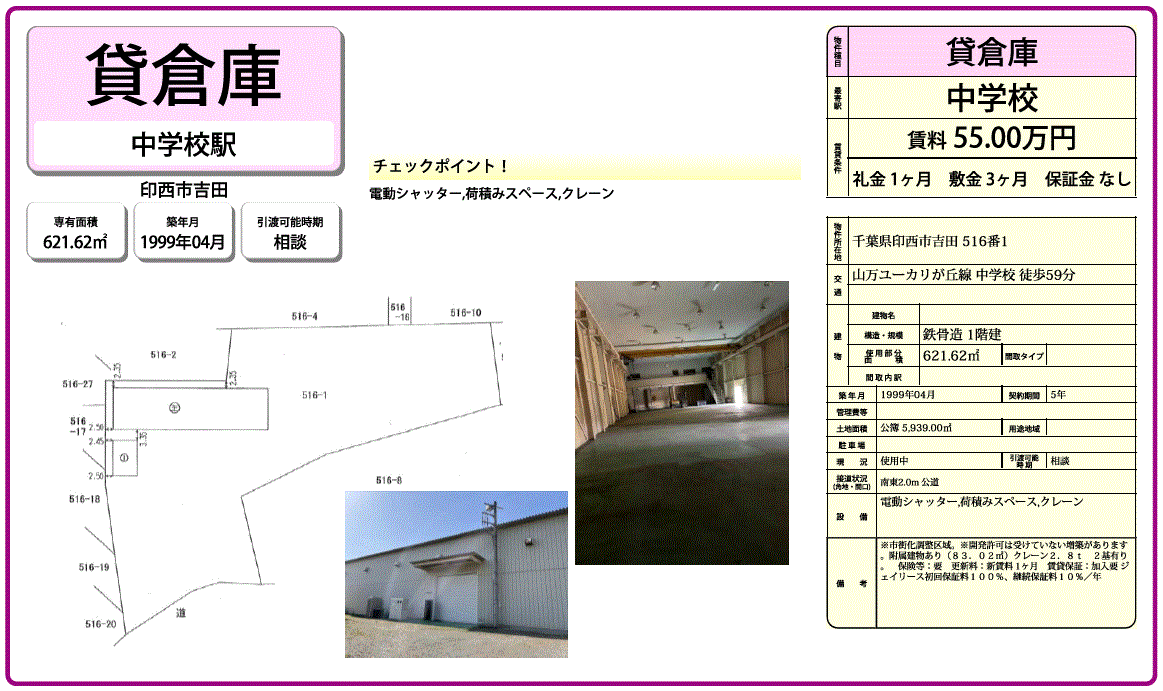 | 設備関連 | 2.8tクレーン2基 電気引き込み有 電動シャッター | ||