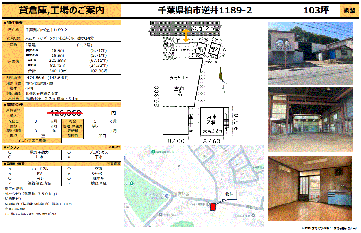 *天井高:倉庫5.1m、事務所2.2m *他面積(2階建事務所棟):各階5.71坪 *中途解約時、解約違約金あり |