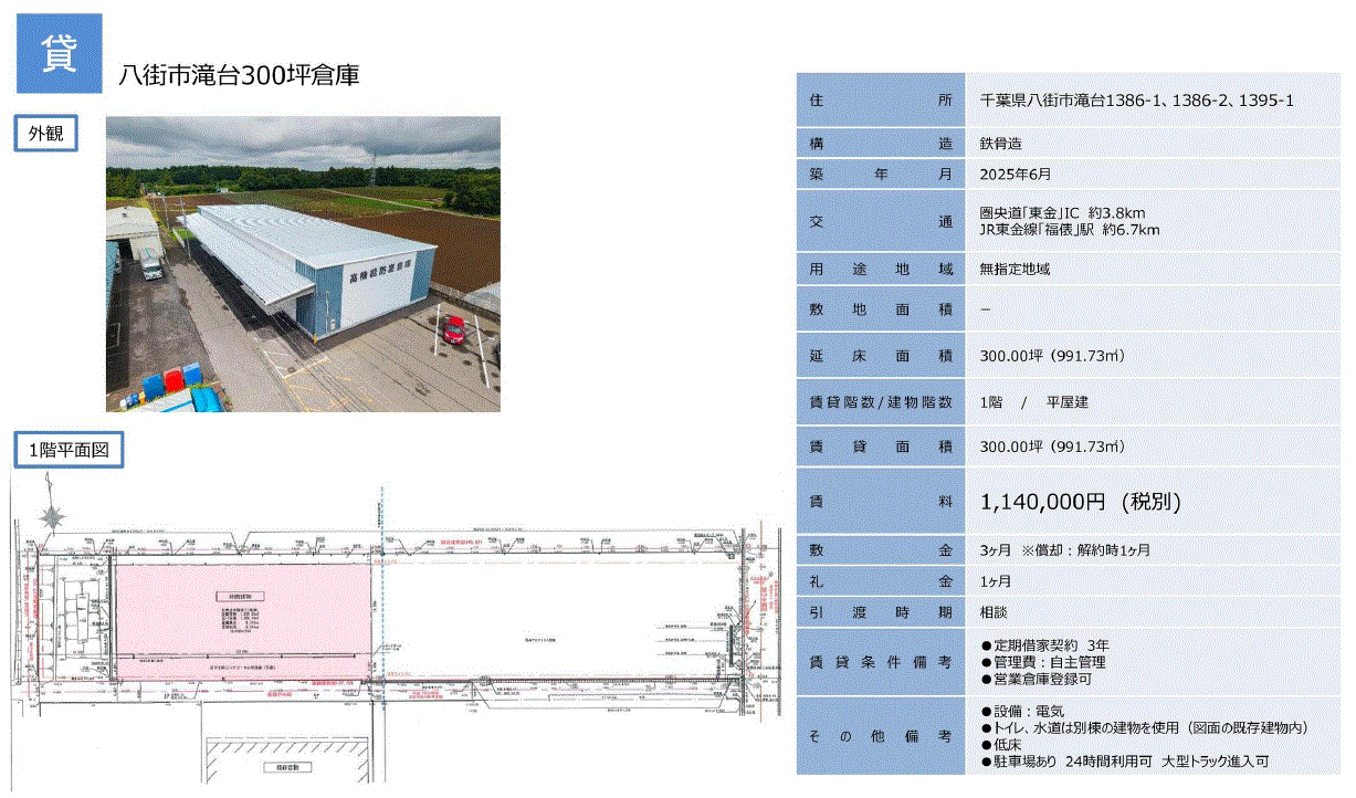 建物面積 | 991.73m²/300坪 | 構造/階数 | 鉄骨造/平家建 |
