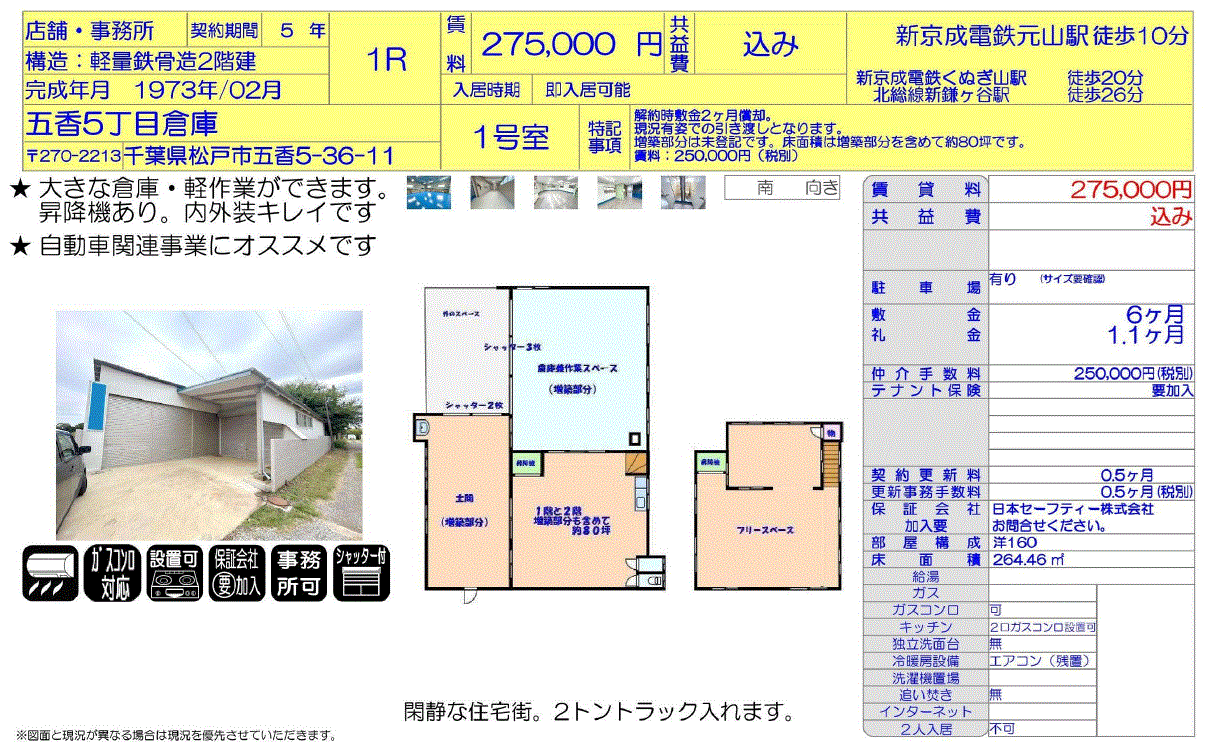 | 沿線/駅 | 京成松戸線/元山駅 徒歩10分 | 高速道路出入口 | |