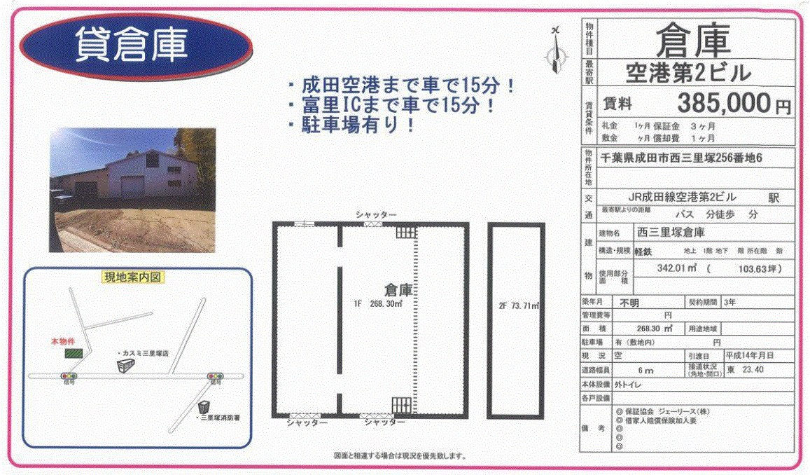 | 沿線/駅 | 京成本線/東成田駅 徒歩20分以上 | 高速道路出入口 | |