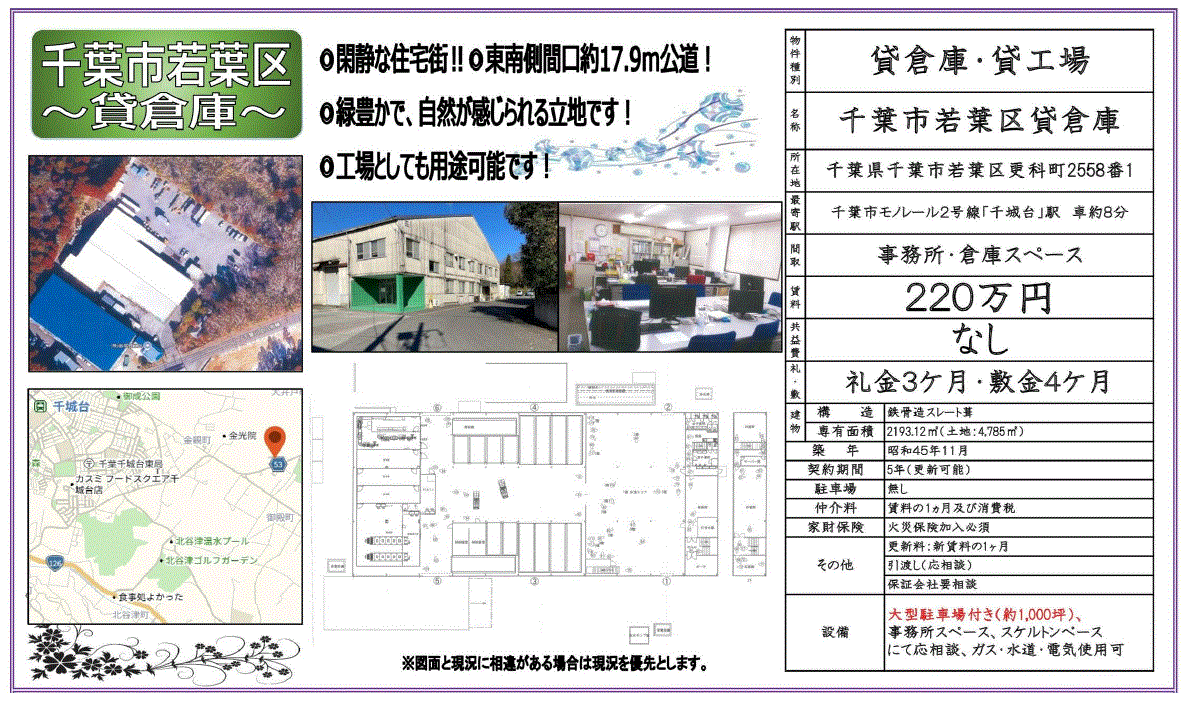 | 沿線/駅 | 千葉モノレ/千城台駅 徒歩20分以上 | 高速道路出入口 | |