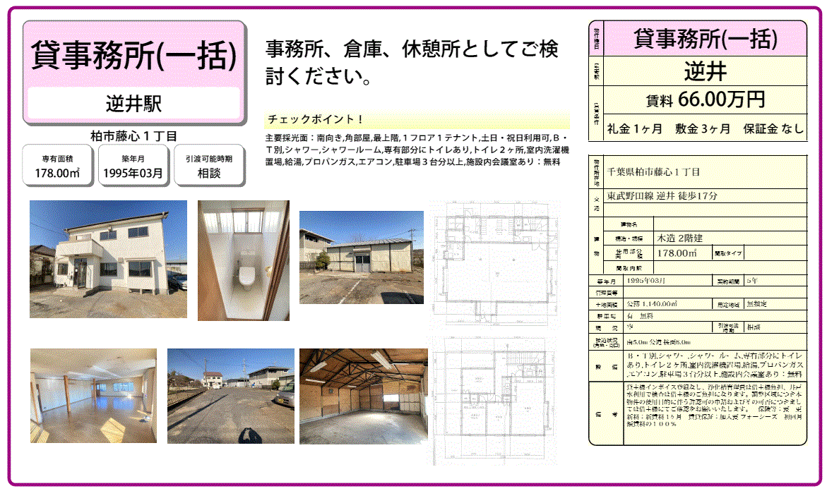 | 沿線/駅 | 東武野田線/逆井駅 徒歩17分 | 高速道路出入口 | |