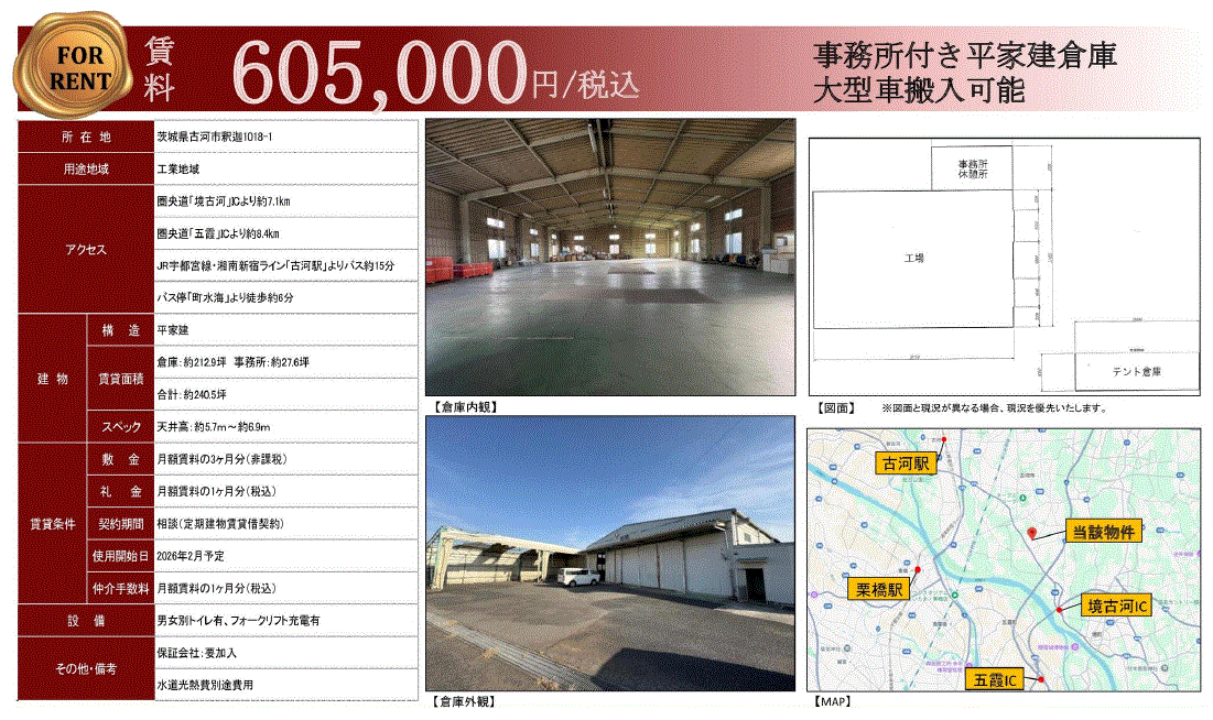 | 設備関連 | 事務所有 電気引き込み有 男女トイレ フォークリフト充電設備 | ||