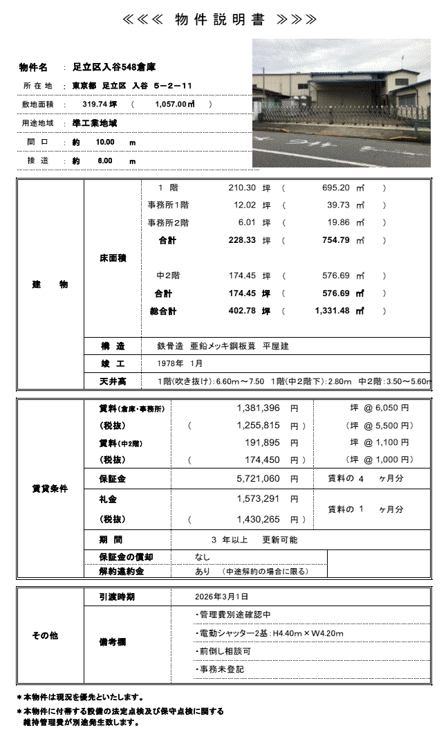 *他面積:2階建事務所(1階約12.02坪、2階約6.01坪)、未登記 *中途解約時、解約違約金あり *火災保険加入要 |