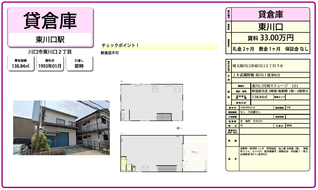 | 物件番号 | 2402429 | 物件種目 | 倉庫 |
