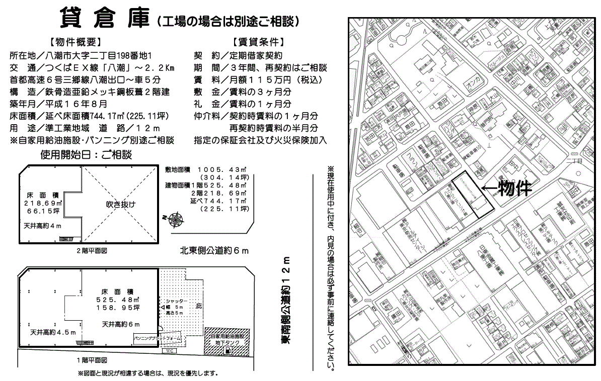 *3年定期建物賃貸借契約(再契約相談) *天井高:1階約4.5m 吹抜部6m、2階約4m *指定保証会社加入要 *指定火災保険加入要 *更新事務手数料0.5ヶ月分 *自家用給油施設、バンニング別途ご相談 ※一部写真は、以前の募集当時に撮影したものなので、現況と異なる場合があります。現況優先となります。 |