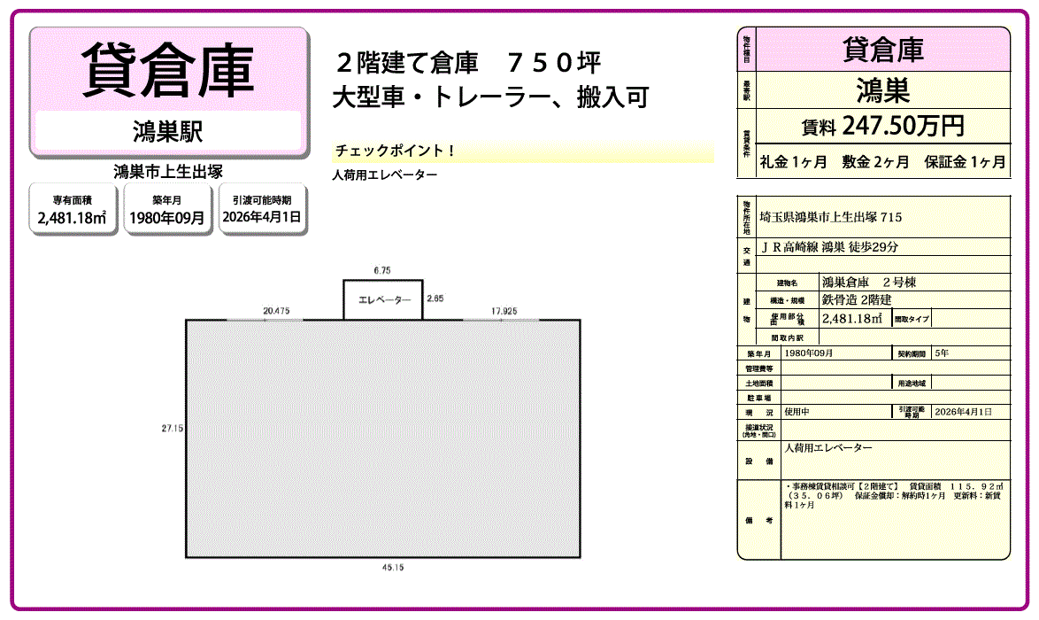 建物面積 | 2,481.18m²/750.55坪 | 構造/階数 | 鉄骨造/2階建ての1~2階部分 |