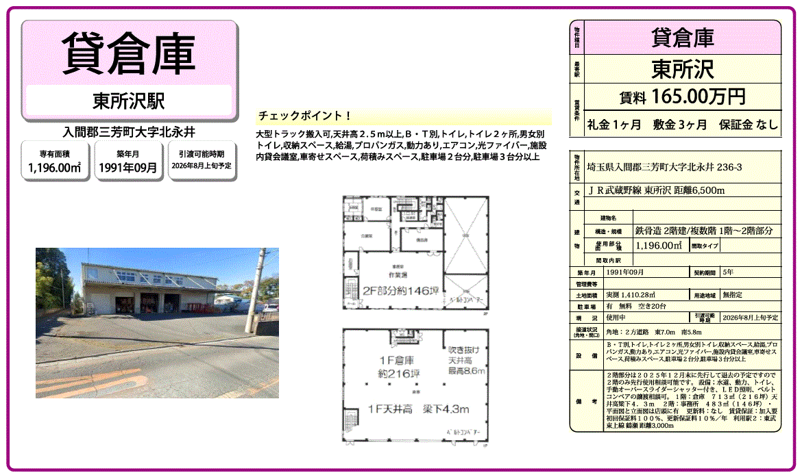 *ベルトコンベア譲渡相談可 *1階梁下約4.3m(吹抜部を除く) *借家人賠償付保険加入要 *保証会社加入要 |