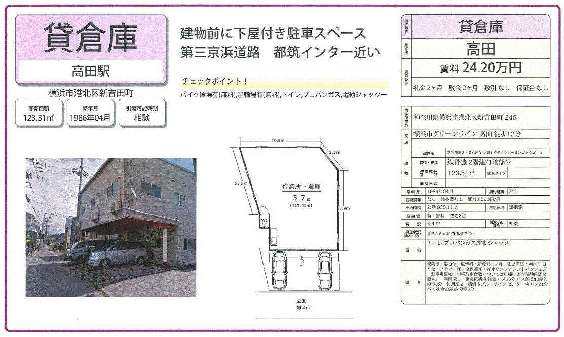 | 沿線/駅 | 横浜市営地下鉄グリーンライン/高田駅 徒歩12分 | 高速道路出入口 | 第三京浜道路 都筑 |